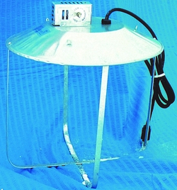 Burner is designed to save fuel. Designed to produce more heat with less gas consumption due to the unique 2-point infra-red heating unit. Infra-red rays are produced at the ribbon burner and ceramic and become heat only on contact with chicks, litter or equipment. CGA approved. 1000 chick capacity. Galvanized 34” canopy, one piece lifetime ceramic, stainless steel burner. Available in Propane or Natural gas