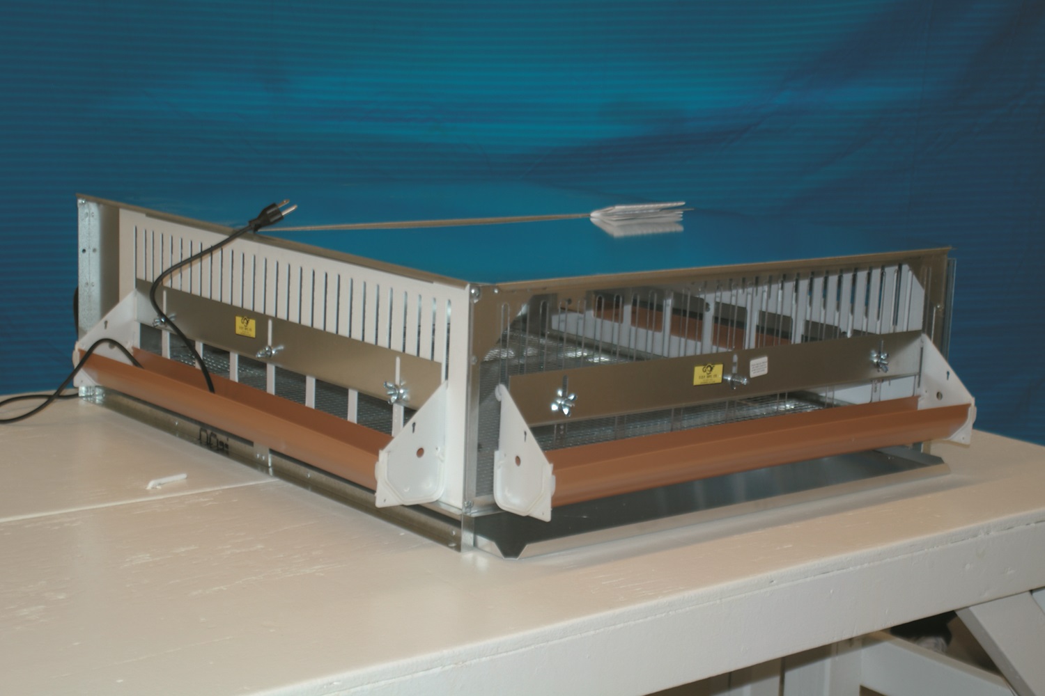 An electric brooder for baby poultry or quail. Capacity 125 day-old chicks and up to 50 four-week olds. Quail capacity-100 to fourth week. Use in any building where temperature does not fall below 60F. Sliding poly mesh door panels on front and one side. Includes 3 liter poly bottle drinker and 580 cubic inch poly capacity feeder. Both feeder and drinker fill from outside. Drinker trough is self-cleaning. 1/2" PVC coated wire floor. Dropping pan easily removed for cleaning. Thermostatic control, 250 watts. Overall size-31"W x 36"L x 14"H (interior height 9"). 110V ac only. 54 lbs.